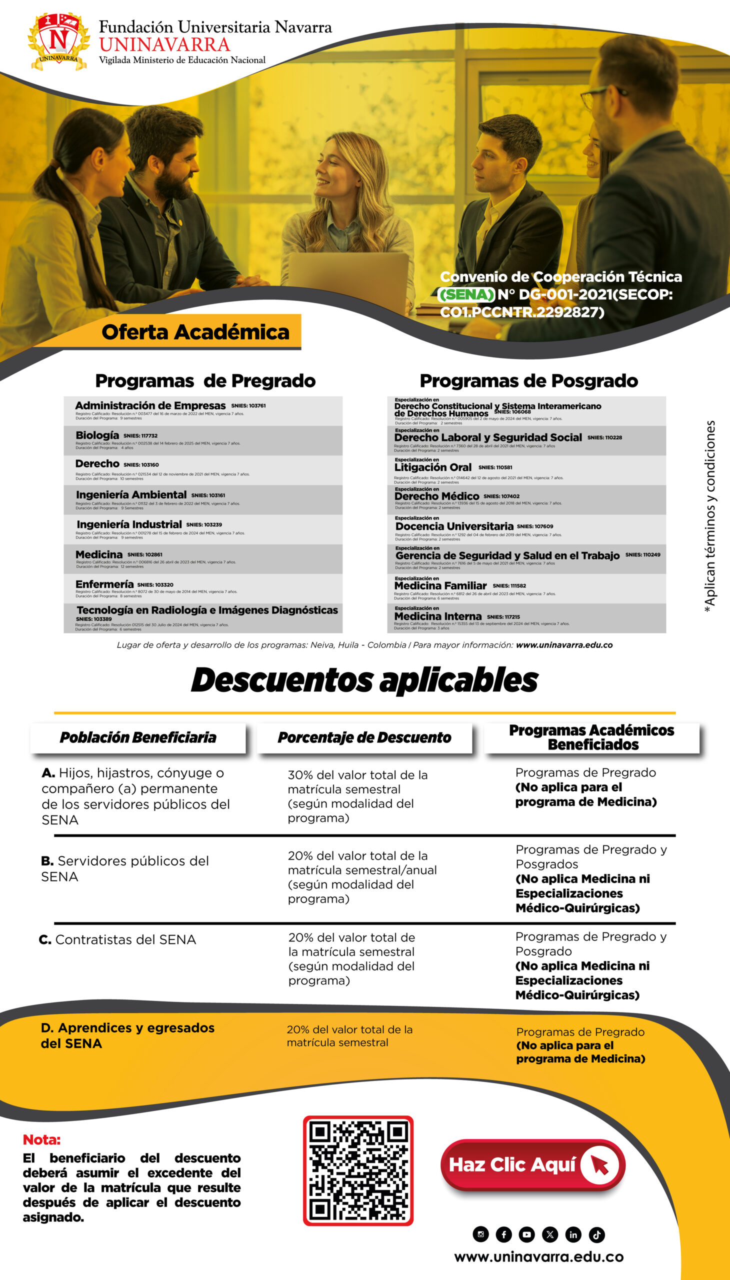 SENA graduates of the Technical and Technological levels at the national level may, through a process of APPROVAL and the previous fulfillment of the requirements established by the NAVARRA UNIVERSITY FOUNDATION - UNINAVARRA, to study in the professional careers offered by the NAVARRA UNIVERSITY FOUNDATION - UNINAVARRA according to the following list: