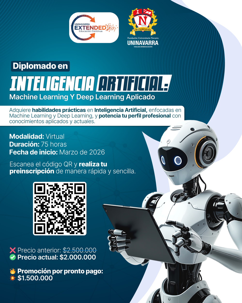 El Diplomado en Inteligencia Artificial: Machine Learning y Deep Learning Aplicado de UNINAVARRA ofrece una formación integral y práctica para comprender, construir y aplicar soluciones de IA en contextos reales. A lo largo de 75 horas en modalidad online, el participante fortalecerá competencias para trabajar con datos, seleccionar enfoques de modelado, entrenar algoritmos supervisados y no supervisados, y explorar técnicas modernas de deep learning orientadas a problemas del mundo profesional.