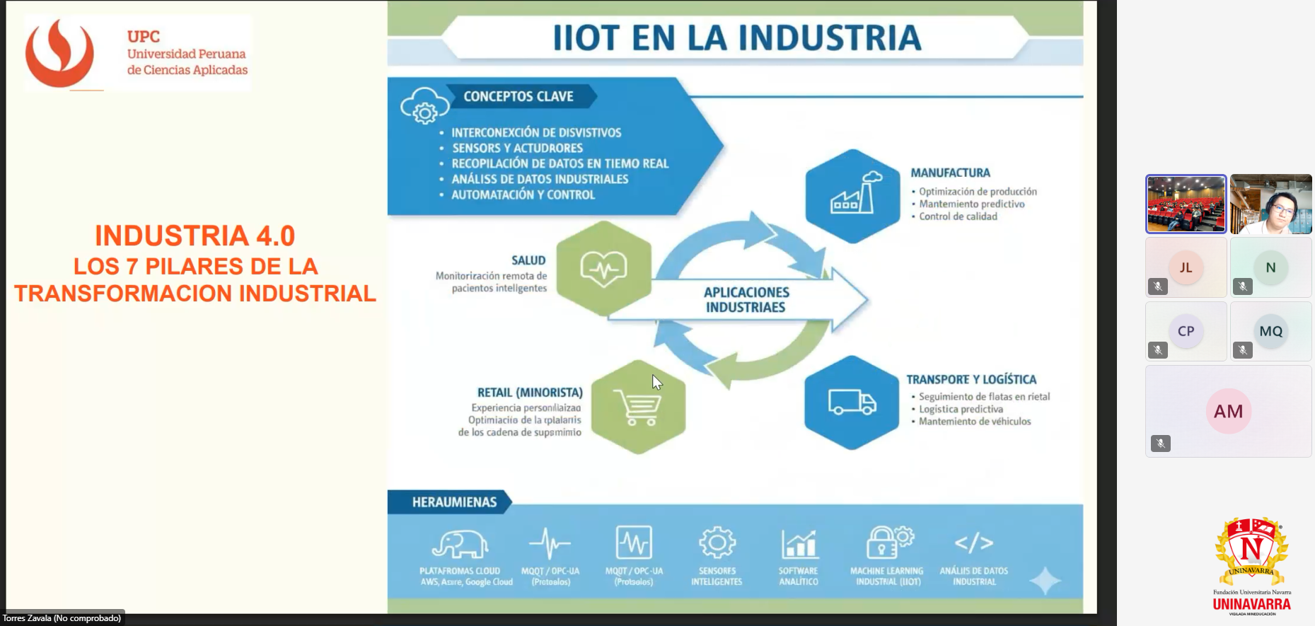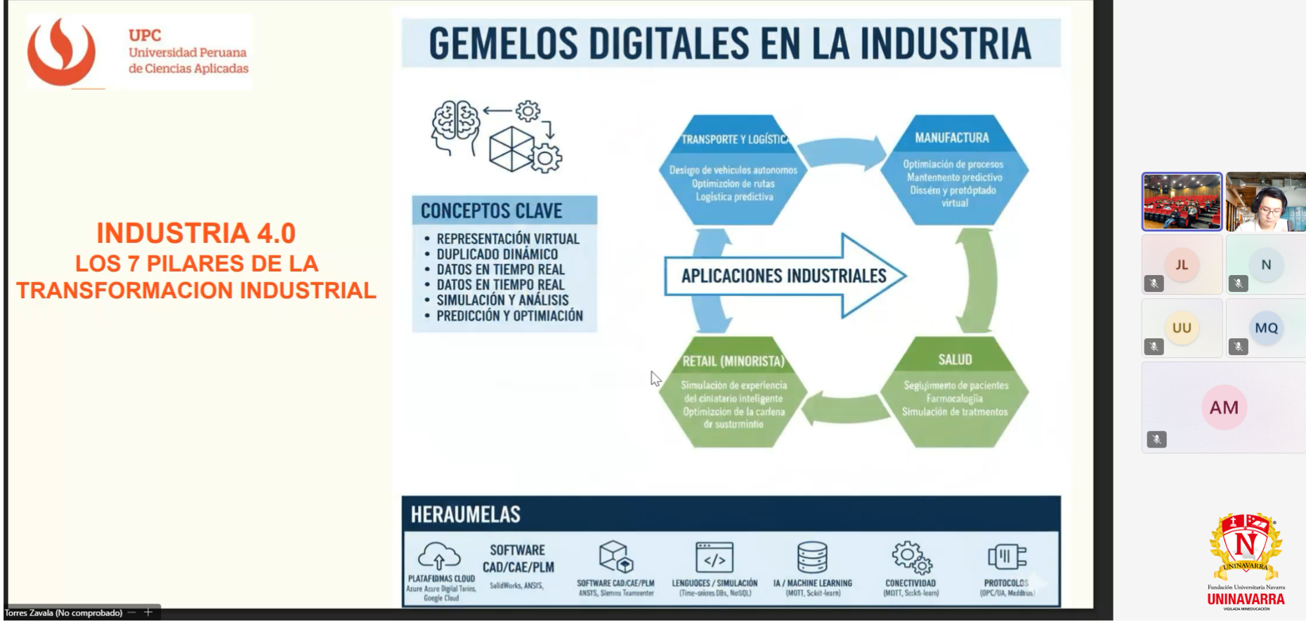 The Fundación Universitaria Navarra - UNINAVARRA continues to consolidate its presence in international academic scenarios thanks to the participation of Engineer Jhon Sebastián Perdomo González, professor of the Industrial Engineering Program, in the International Seminar “Artificial Intelligence and Big Data in the Optimization of Industrial Processes”, held at the Peruvian University of Applied Sciences (UPC). This meeting brought together experts, researchers and professionals from different countries to discuss the advances, challenges and opportunities that emerge in the framework of the industrial digital transformation. Perdomo's intervention stood out for its conceptual rigor, its pedagogical clarity and its ability to connect theory with the real needs of the industry, projecting UNINAVARRA's commitment to a modern, relevant and global training.