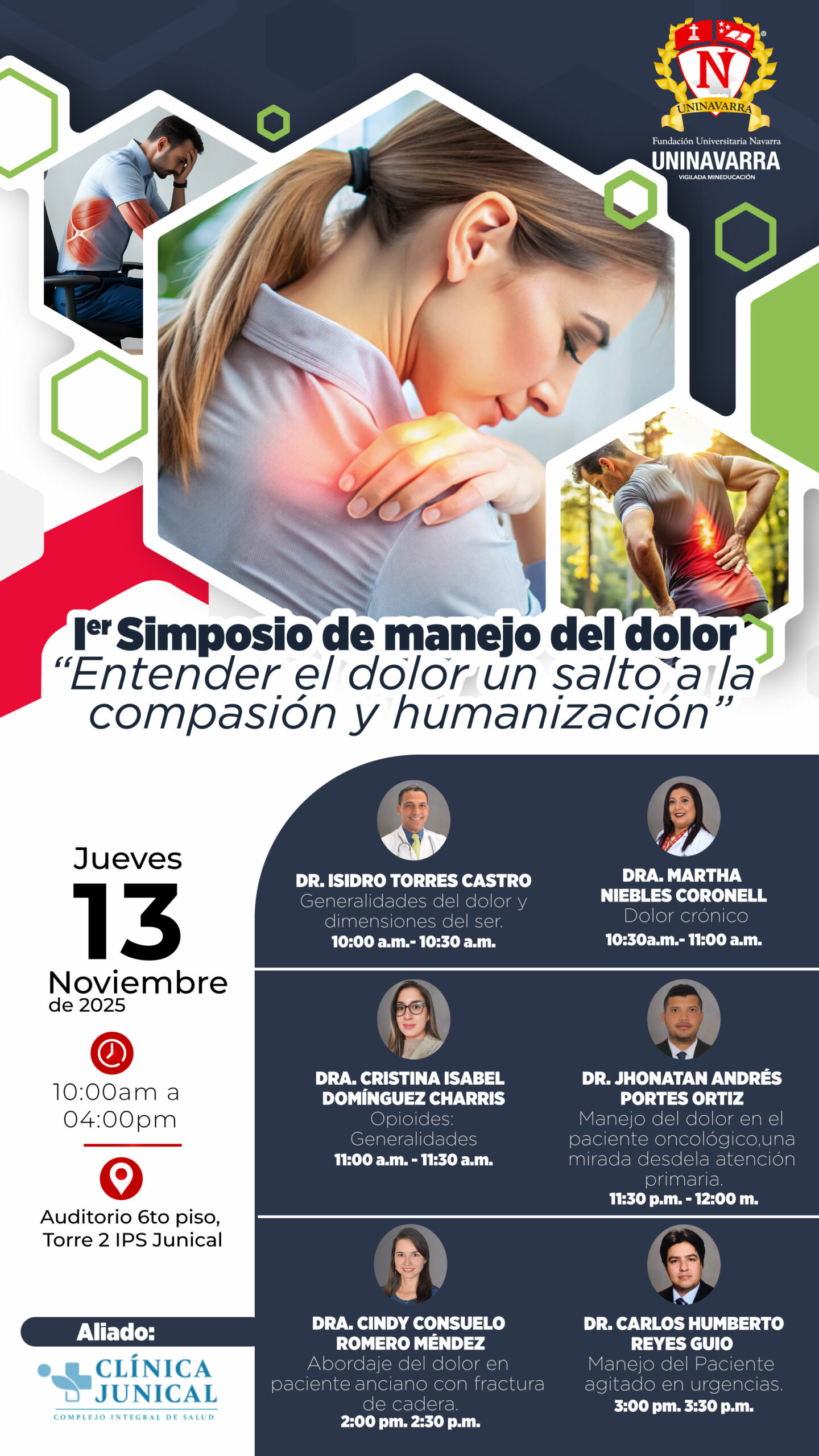 La Fundación Universitaria Navarra – UNINAVARRA, en alianza con la Clínica Junical, invita al I Simposio de Manejo del Dolor, un espacio académico que promueve la comprensión integral del dolor desde una mirada interdisciplinaria, empática y centrada en la persona.