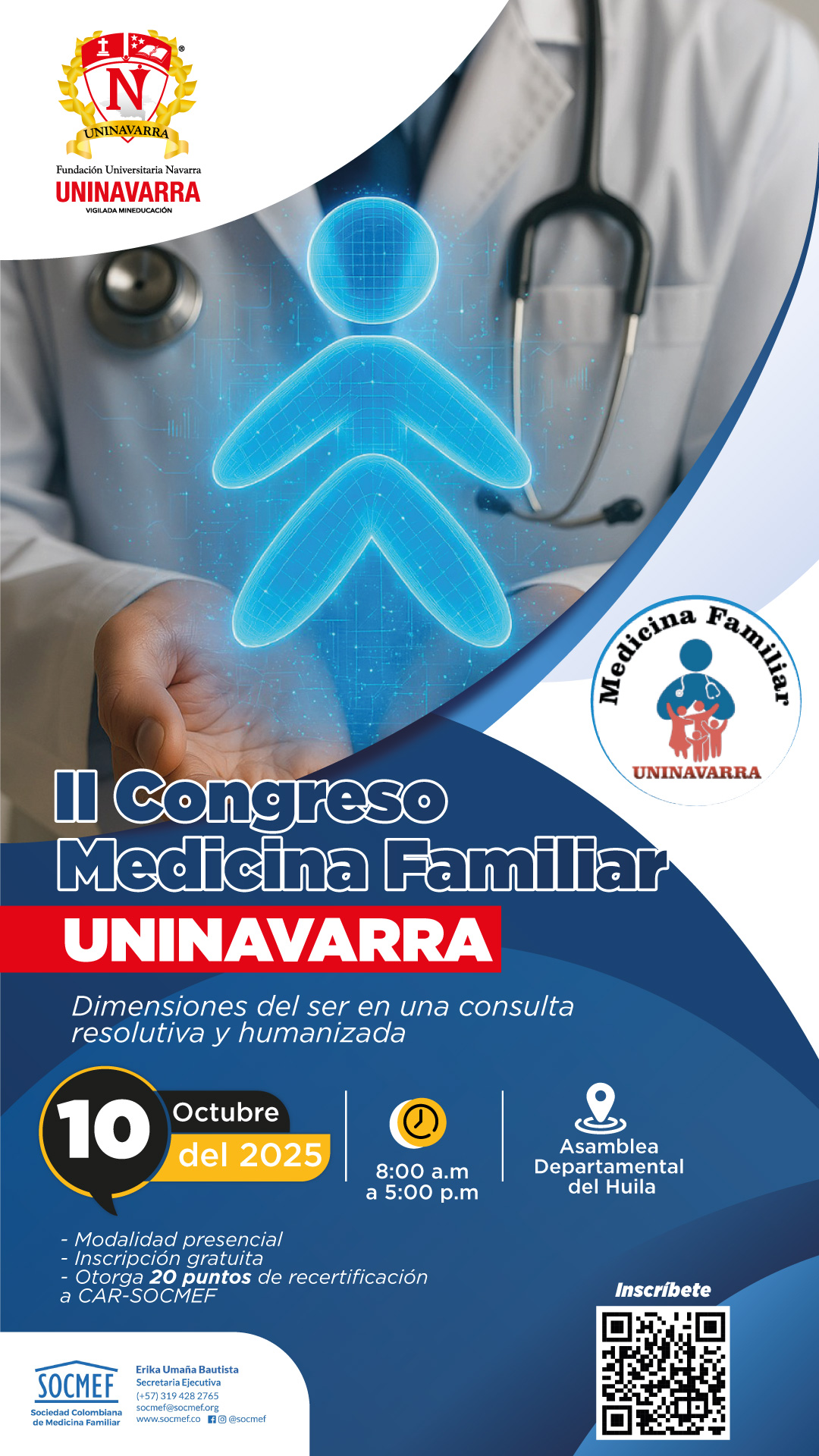 El Posgrado en Medicina Familiar de la Fundación Universitaria Navarra – UNINAVARRA te invita al II Congreso de Medicina Familiar: "Dimensiones del ser en una consulta resolutiva y humanizada". Este evento presencial, avalado por la SOCMEF (Sociedad Colombiana de Medicina Familiar) en la región sur colombiana, está dirigido especialmente a médicos generales, docentes y estudiantes […]