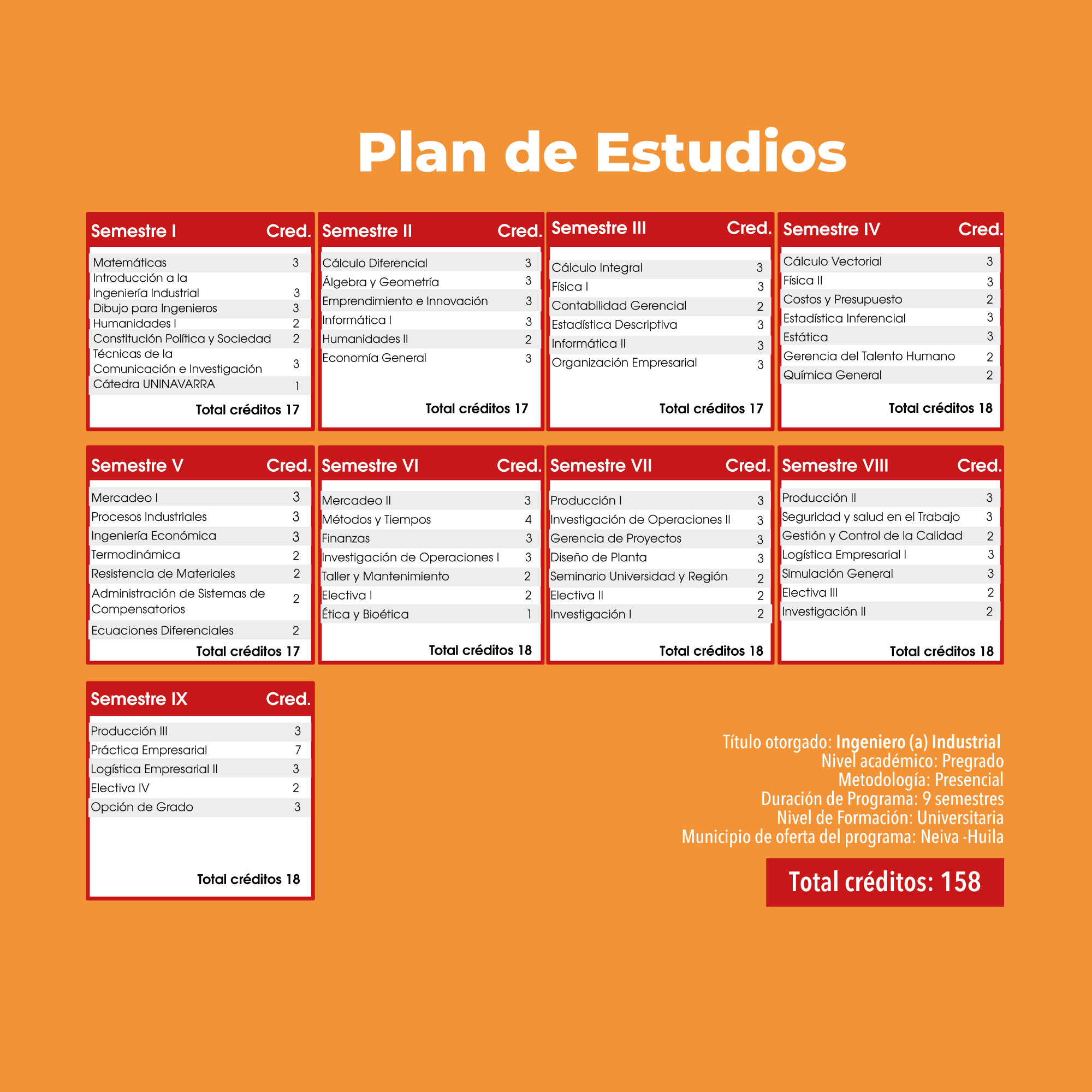 El programa de Ingeniería Industrial de UNINAVARRA se posicionará profesionalmente por la calidad académica y humana de sus egresados, quienes demostrarán permanentemente su capacidad de trabajo y liderazgo.